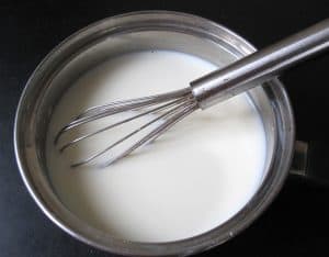 Ce n’est pas une sauce à base de roux blanc. On la nomme béchamel mais ce n’en est pas vraiment une. Cette sauce épaissit grâce à un empois d’amidon. Sous l’action de la chaleur, les molécules d’amidon se gonflent de liquide et augmentent de 20 à 30 fois de leur volume initial. Elles éclatent en s’agglutinant les unes aux autres et forment un empois. C’est pour cela que la sauce épaissit.