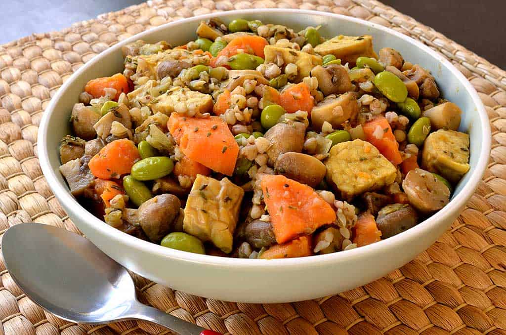 Cette poêlée constitue un repas complet végétarien ou végétalien.