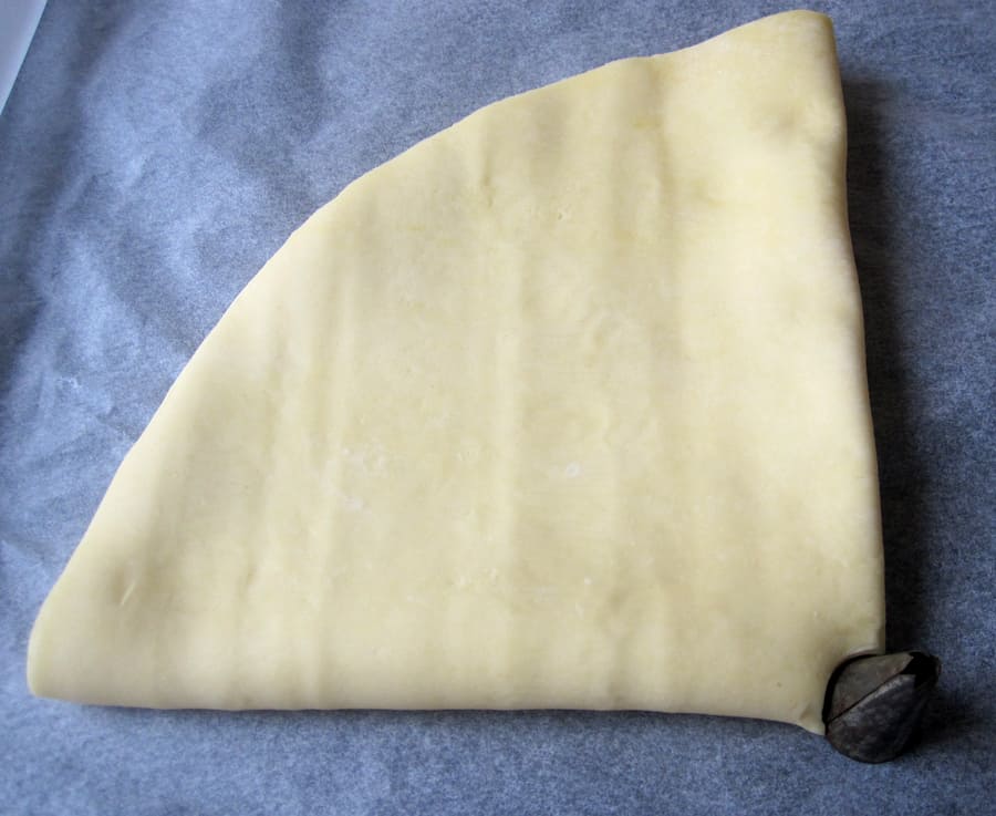 Une astuce pour faire la cheminée dans la pâte qui sert de couvercle. Plier votre cercle en 4 après l’avoir coupé à la dimension extérieure du moule puis à l’aide d’une douille de 1,5 à 2 cm de diamètre enlevez un petit cercle que vous entourerez d’un petit ruban de pâte lorsque vous l’aurez positionné sur la garniture et fait la soudure avec la pâte du dessous.